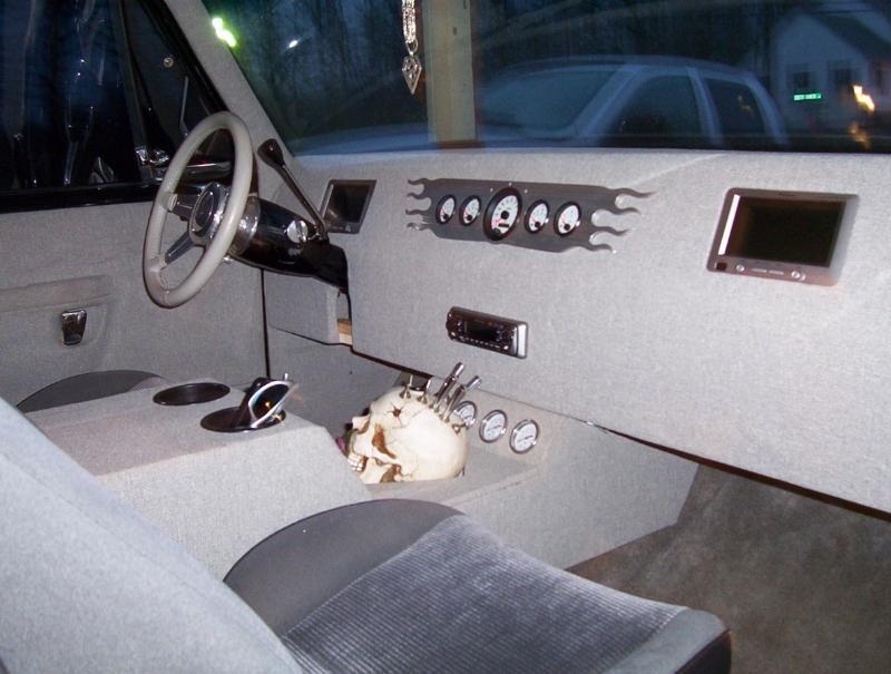 ive shaved evry thing that i could think of off this truck. side markers, locks, door handels, drip rails, embalems, trim, tailgate. i added a rollpan in the back and shaved the front bumper and set it back 3in. added a freched antenna on the passanger side. black paint with kromlusion flames