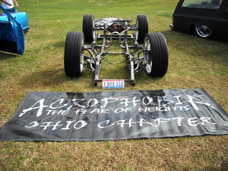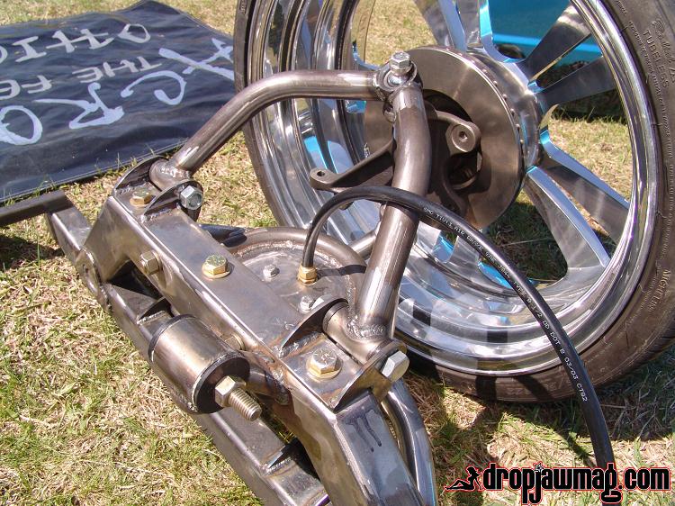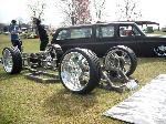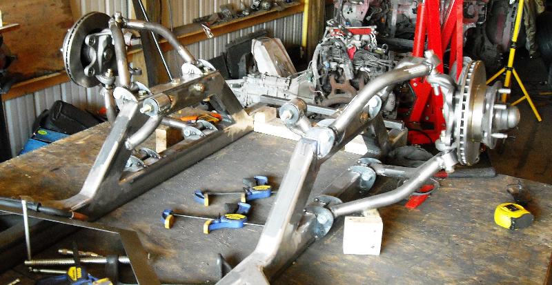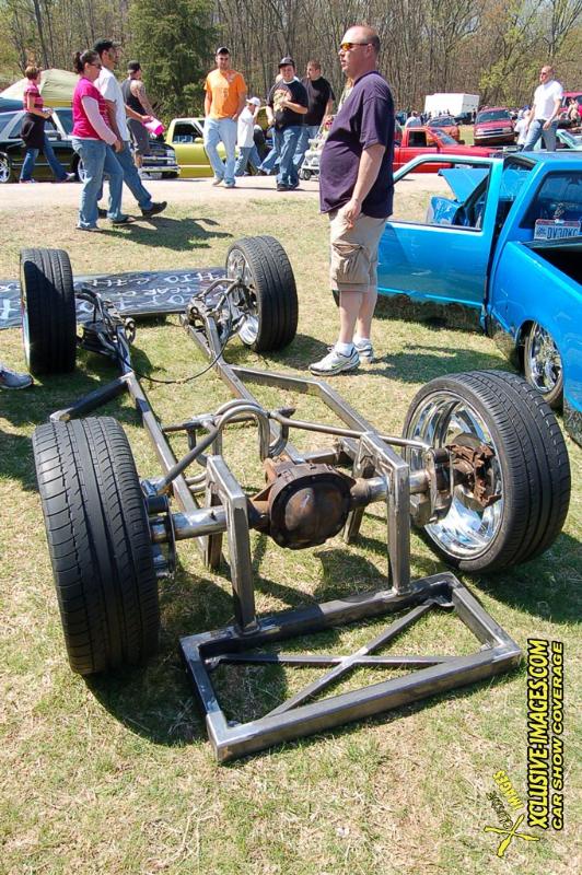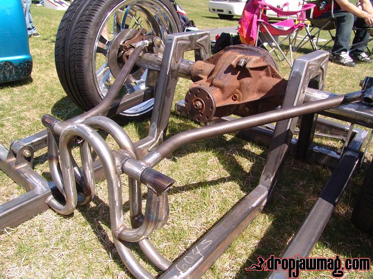 full chassis made by myself, uniballs in front, custom made control arms, suspension design done in autocad, 1 1/4" DOM 3/16 wall tubing used throughout. Rest of chassis is 2x3 3/16 wall, triangulated fourlink, 8.8 4.10 explorer rear end, toyota 2" drop spindles reamed and sleeved for bolt instead of ball joint, mustang II rack and pinion