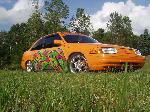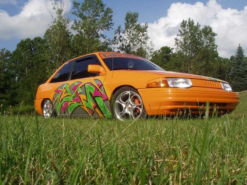 Shaved tail lights, door handles, antenna, body line. Double row l.e.d tail lights, frenched in license plate box, frenched in antenna on passenger fender, and smothed out rear of the car. Orange painted with graphics painted on the side and hood.