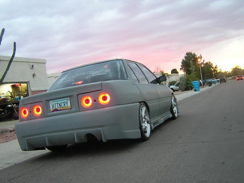 Shaved handels, Custom fitted bodykit, clear corners, green(now grey) primer. frenched R32 skyline Taillights. started 04' silverado headlight conversion.