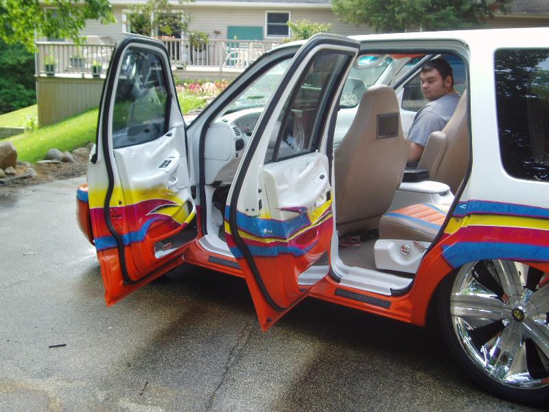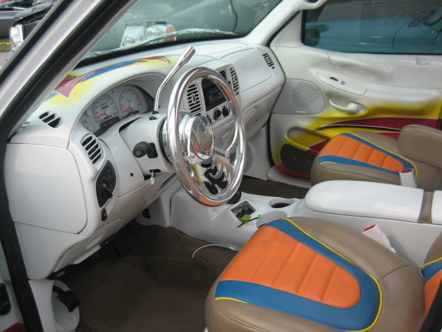 **SOLD** Tan leather seats Completly smoothed and paint dash, plus all other plastic in truck are painted. Custom center console housing center channel speaker, a Ride Pro Controller, and a twelve inch sub between the rear bucket seats. Custom fiberglass kick panels, Smoothed and fiberglassed door panels, and graphic runs throughout the interor