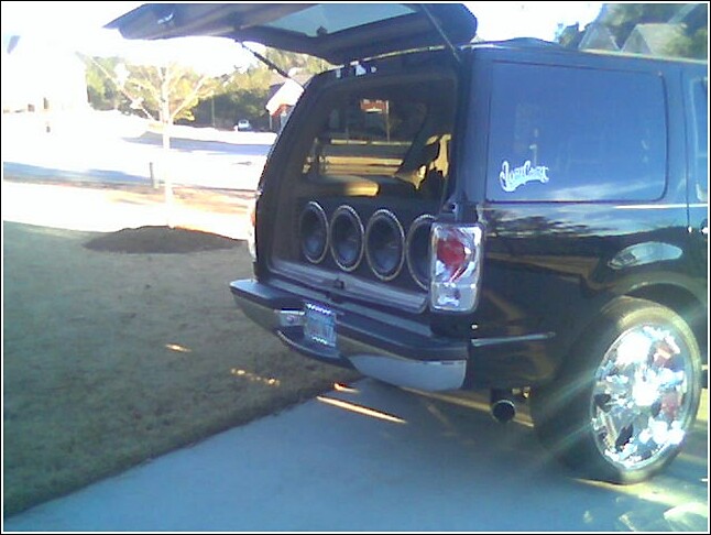 AlpineCVA 1006 6.5 head unit , 4 12" w3 D6 SUBs in a custom box, MB Quarts mids & highs( F ) , MB Quarts mids ( R )Lanzar tweeters front door and rear doors , Rock Fosgate amps and caps under the seats( 2100 watts )Plye 5.4's screens in head rest ,10.5 center ceiling of suv( four screens running off a Alpine DVD player mounted in a custom design