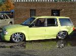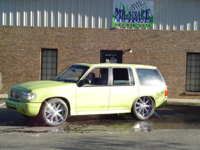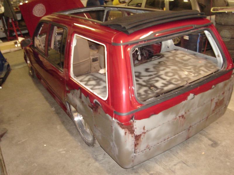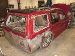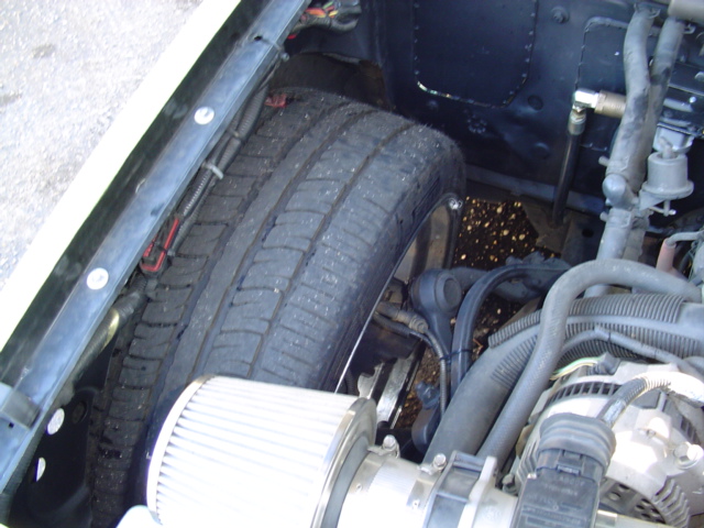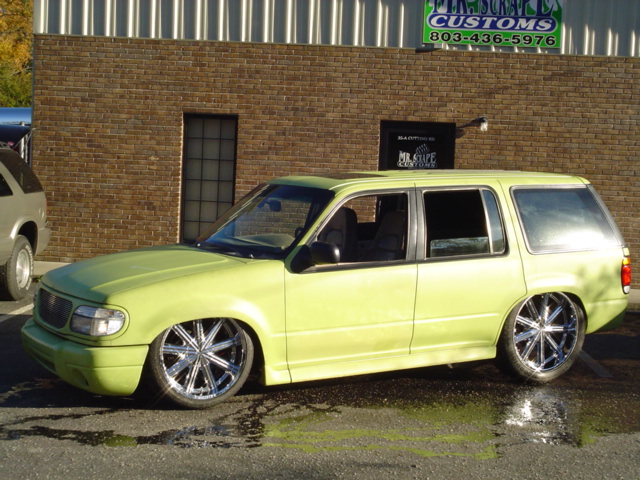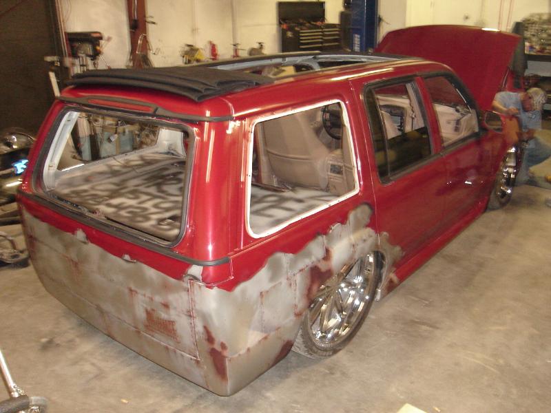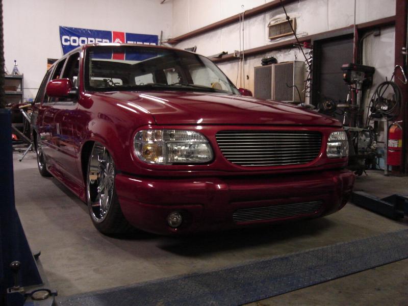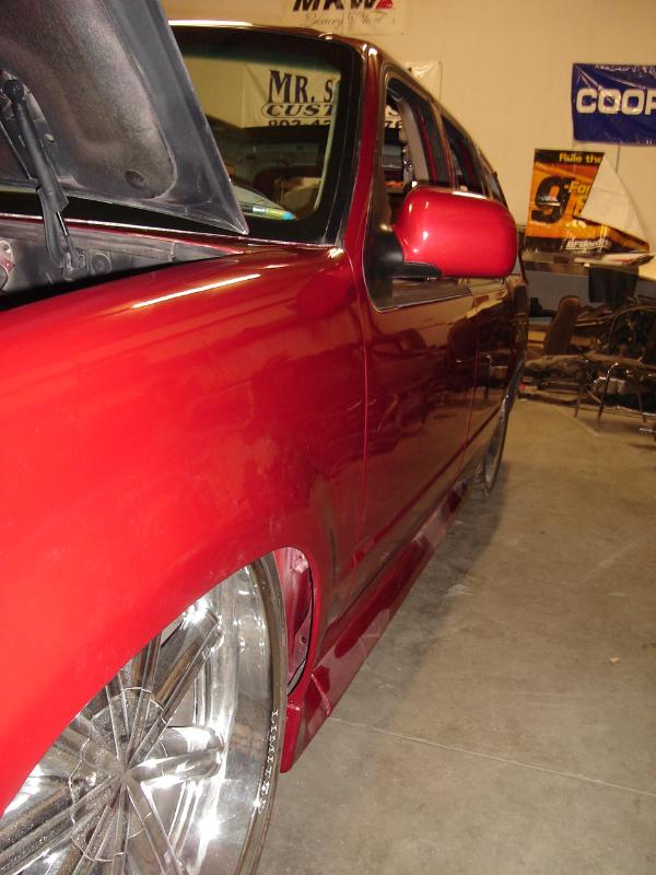 Bagged on 22's in front and 24's in rear. Lays front crossmember. Tubbed doors, relocated bear claw latches. Custom 2-link, custom upper control-arm mounts and flipped lower ball joints. engine driven compressor
