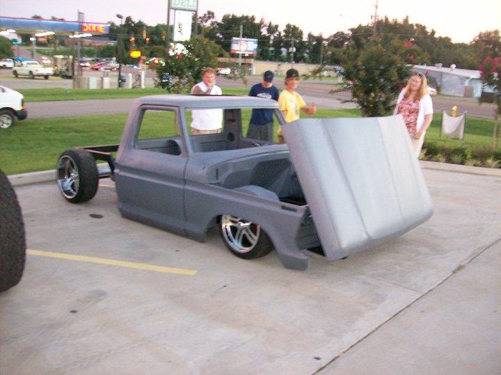 Body dropped,backhalfed,Slicked firewall,forward tilt hood, Shaved drip rails,handles gas filler,Ladder rack holes,and tailgate Custom bed floor,phantom grille, sunroof