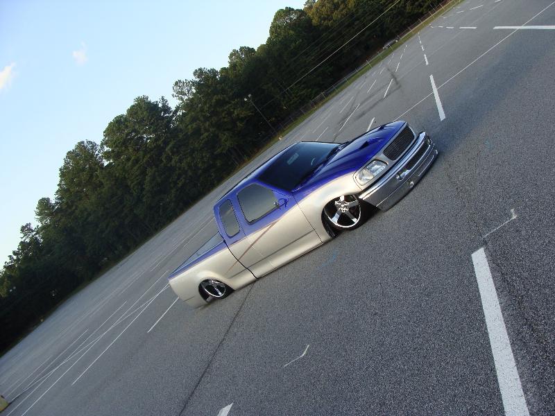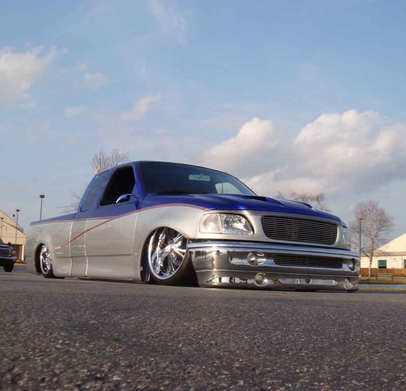 stock floored with 2X4, chromed djm upper and lower control arms, chromed belltech drop spindles, 3-link with a watts link in the rear, re-7s up front, 2600s in the back, 1/2" chrome asco ups, 3/8" chrome asco downs, all 1/2" copper plumbing, 4 viair 480s on 7 gallons, over bodydropped bedfloor, shocks on all 4 corners ~2.5" narrowed off the rear end on each side.