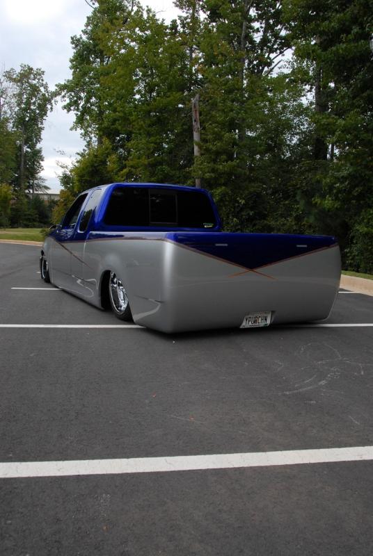 shaved handles, badges, molding, taillights, roof drip rails, bed caps. Grant sheet metal smooth tailgate and rollpan with 2 13.5" bi color LEDs. Then covered in Cobalt Candy Blue, Charcoal Candy, with a Metallic Silver base coat which also acts as the bottom color, orange pinstriping separates each color. Paint job runs through the jams. Stock bed floor that has been raised all the way up. No tubs, no channels.