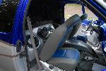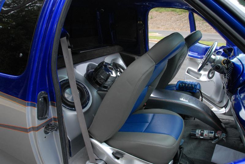 Has super cold A/C! Smoothed and painted all interior panels including the doors and the dash. Same style of paint runs into the inside. Custom center console that comes off of the system box. Charcoal leather with blue leather inserts on the two captain's chairs - real leather not vinyl or bonded leather. System has 3 Audiobahn AWT10X subs powered by an Orion 2500d amp. Also have a set of MB Quarts 5.25" components fiberglassed into the doors. Full fiberglass headliner with fiberglassed visors completely sprayed in the cobalt candy blue. Back and rear windows tinted 2%. Front windows are no longer tinted due to IL state law.