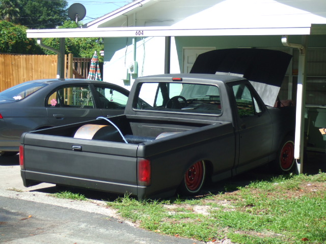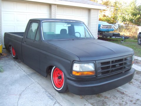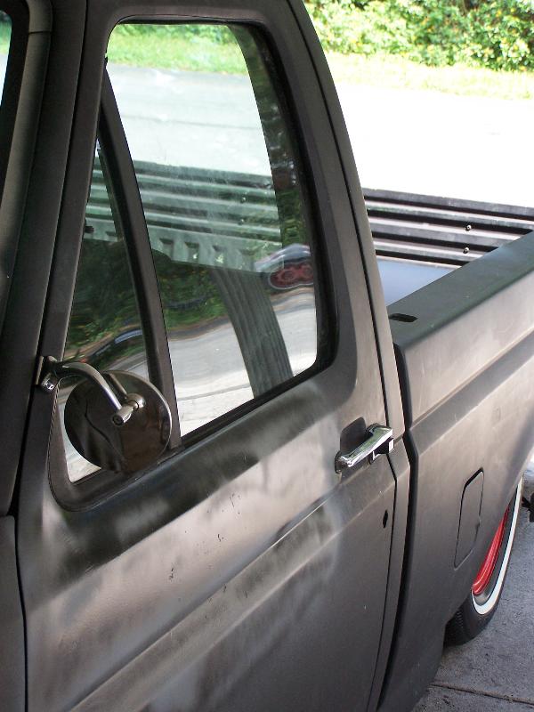 Flat black primer , new chrome door handles peep mirrors tubs for bed 5 inch cowl hood shaved emblems an old mirror holes custom rollpan from cando