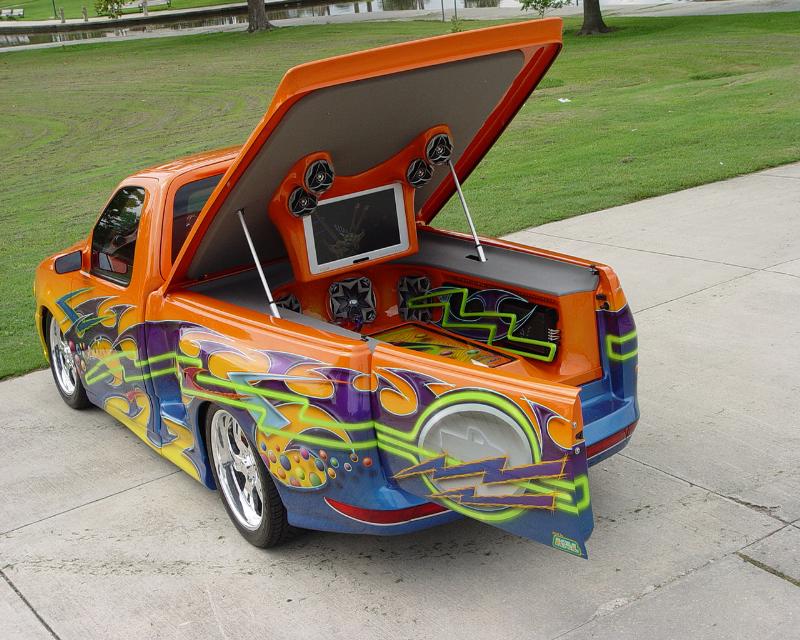 2002 Lincoln navigator front end,shaved door handles,rounded top of doors,smooth side bed steps,smooth bed rails,ground effects kit molded in,rear tail gate smoothed out,rear tail gate swings out,1995 Lincoln mark8 tail light molded in,and custom paint by Kal