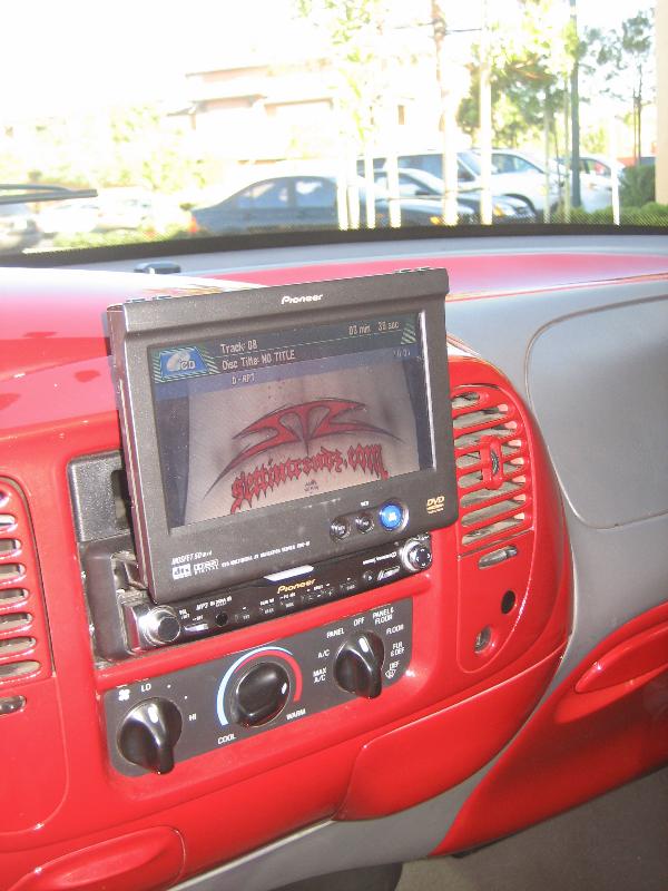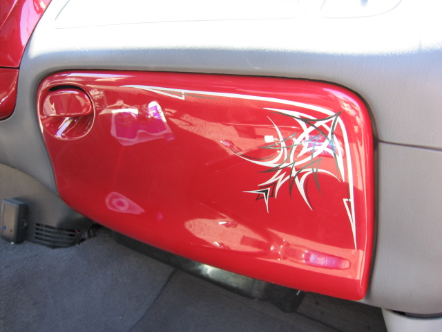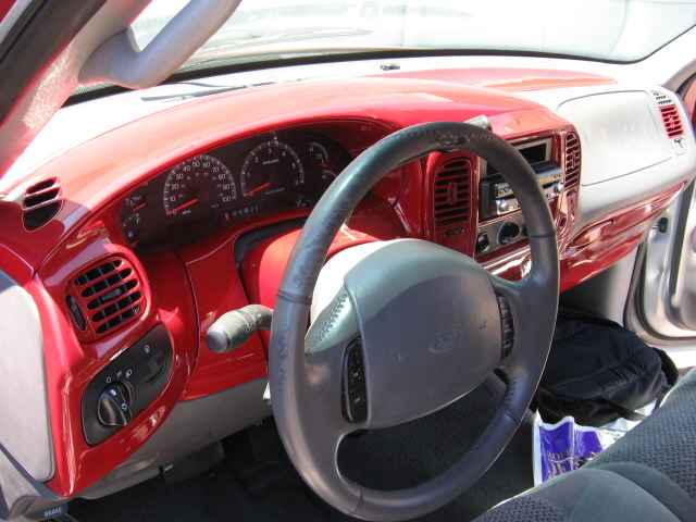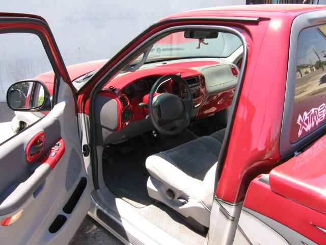 billet steering wheel, chopped seats, everything painted and covered in red, and gray