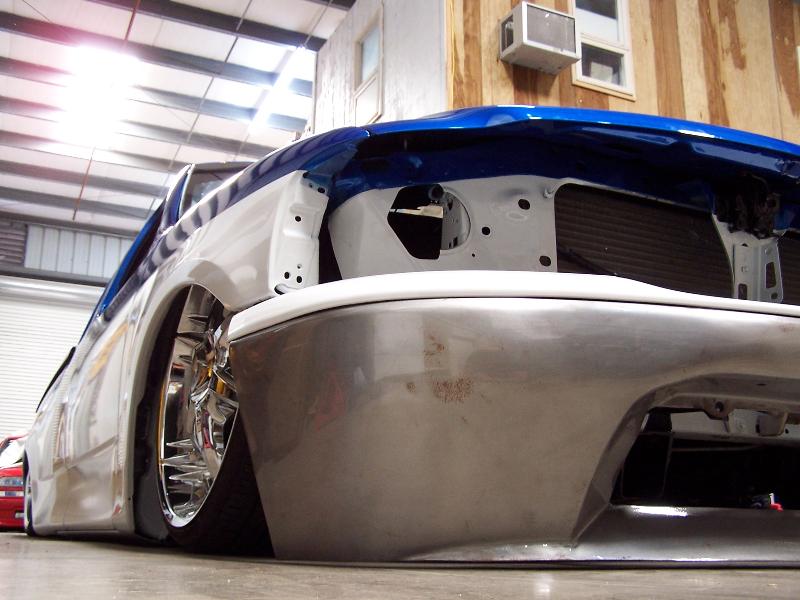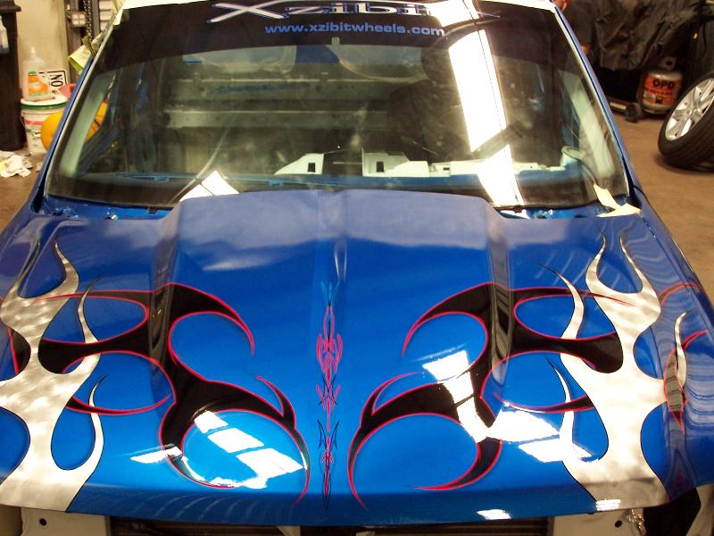 molded on tail, raised bed floor, sick ass one off bumper by bob grant. paint:ford white.dupont vivid blue effect. Flames: black traditional, overlayed with ghost chrome, spun to make it look like spun aluminum, flame work done by cosmic airbrush.
