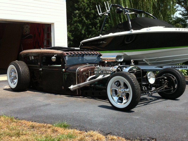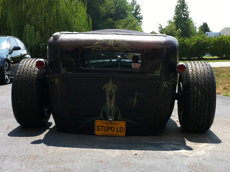 Air ride rear with 4-linked 9" FORD rear with 3:55 gears, Full custom frame front to back, subtle 6" rake from firewall forward, stretched with suicide front end