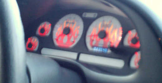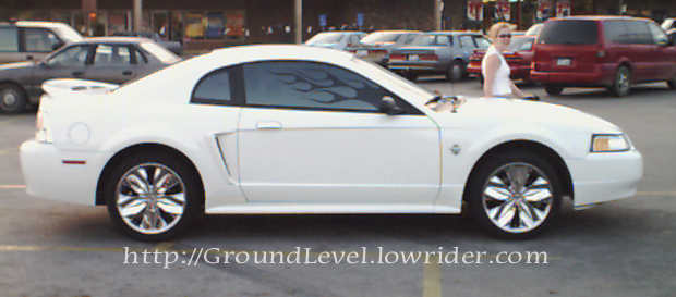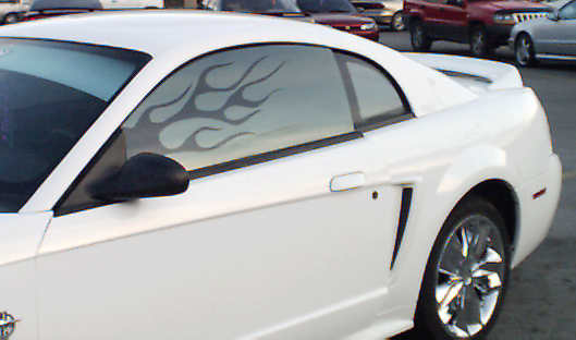 White paint, euro clear tails, flamed pony in front grill, flamed window tint.