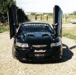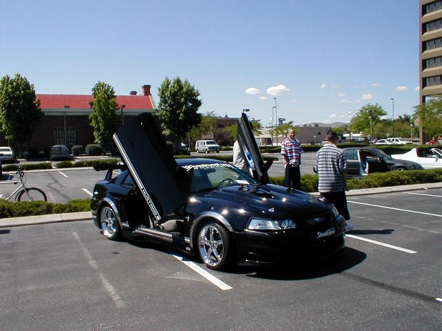 jet black lambo doors, kaminari full body kit, painted to match mack 2 hood painted to match cobra r wing painted to match rear lights projector head lights full street glow undercarage neon kit its blue to match interior, stainless mustang name in rear, custom break light reads out last name,