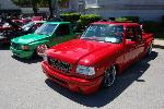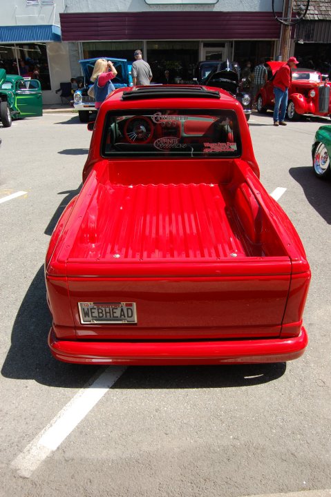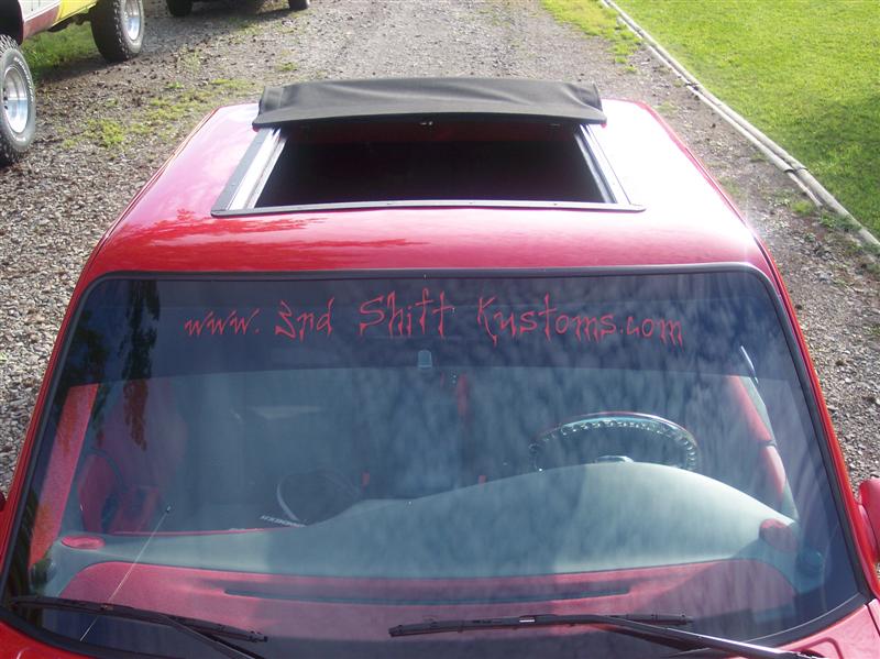 1ST GEN S-SERIES BENCH SEAT, VARIOUS PARTS COVERED IN RED AND GREY TWEED, COLORADO CUSTOMS BILLET CRAWLEY STEERING WHEEL WITH RED LEATHER HALF WRAP, APC WHITE FACE GAUGES, NU IMAGE A/C PANEL, CHROME PLATED A/C KNOBS, ONE-OFF BILLET WEBBED DOOR SILL PLATES, 3 KP AIR GAUGES GLASSED INTO RADIO BEZEL.