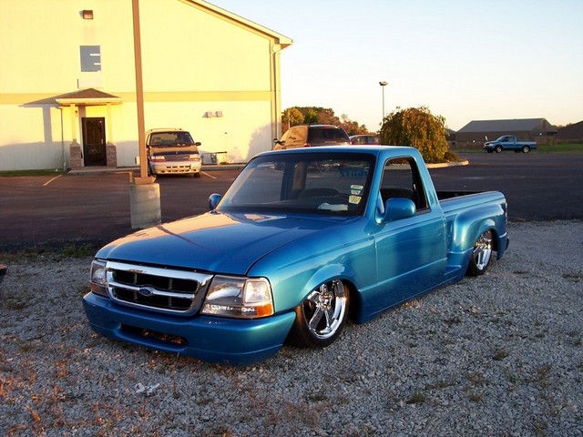 3.5" traditional body drop, shaved, handles, emblems, cowl, 3rd brakelight, smoothed and narrowed rear bumper, 2000 front end swap, and all painted Dupont metallic blue. Sheet metal bed floor, sprayed with Line-X, shaved firewall with wheel tubs also painted body color.