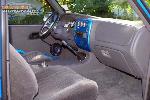 2001 Mecury Mountaineer dash wraped in fake leather, hand made door panels and center console, painted flames on door panels, ratchet window cranks, 1/2" extension and socket shifter. Smoothed and painted air gauge panel, polished stainless gauge panel, Pontiac buckets.