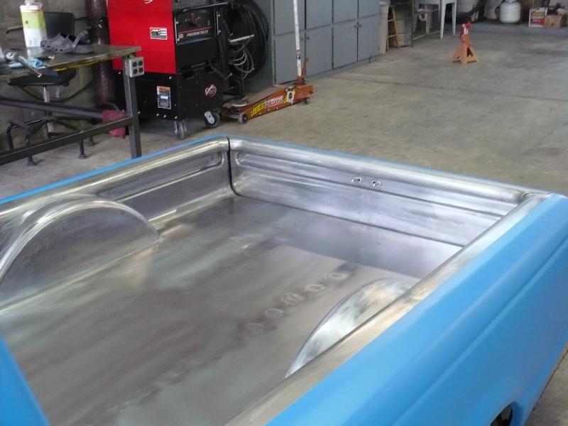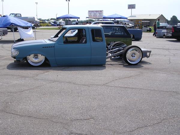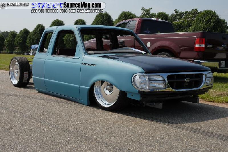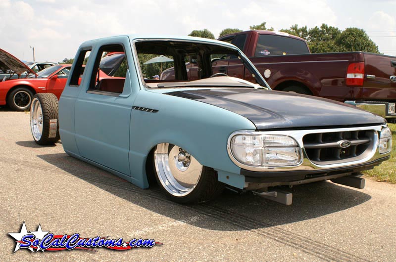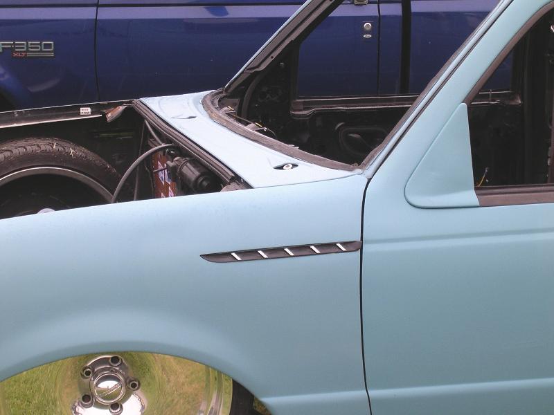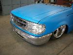 One off front bumper using Explorer parts, Explorer front end conversion, Thunderbird fender vents, shaved bodyline in front of vents, fully shaved cab, smoothed back cab wall and front bed wall with custom skins by Grant Kustoms, tilt bed, full sheetmetal bed with functioning tailgate, shaved tailgate, shaved taillights and rollpan using Grant Kustoms products