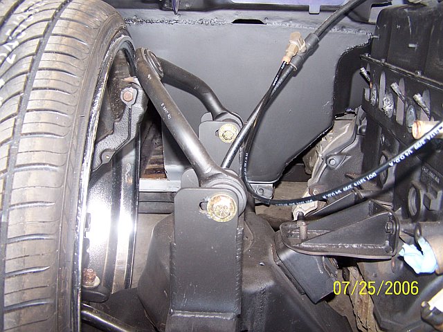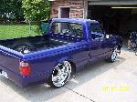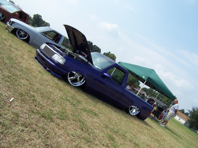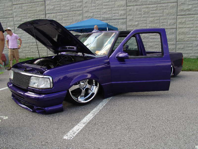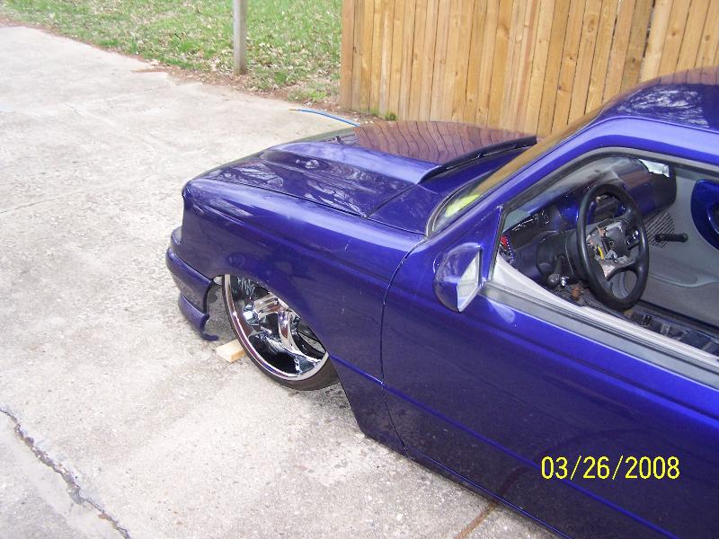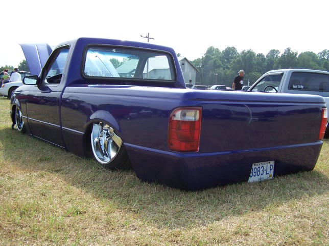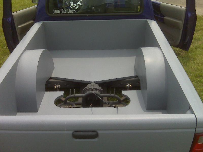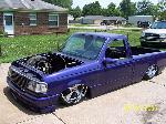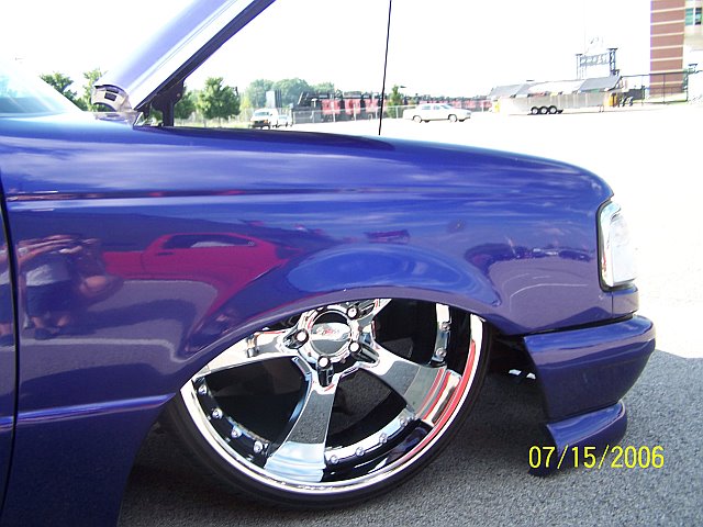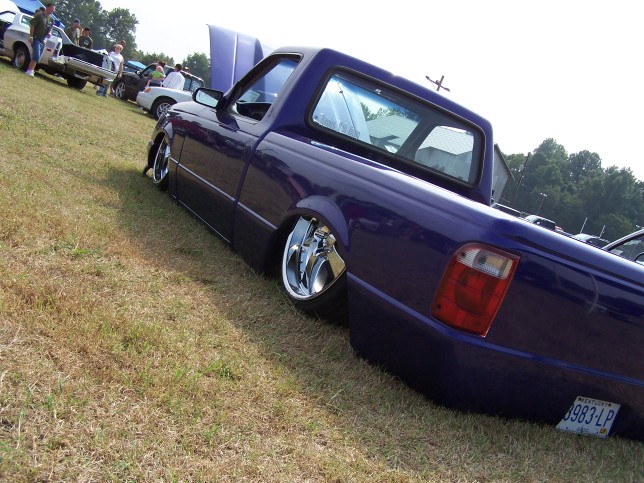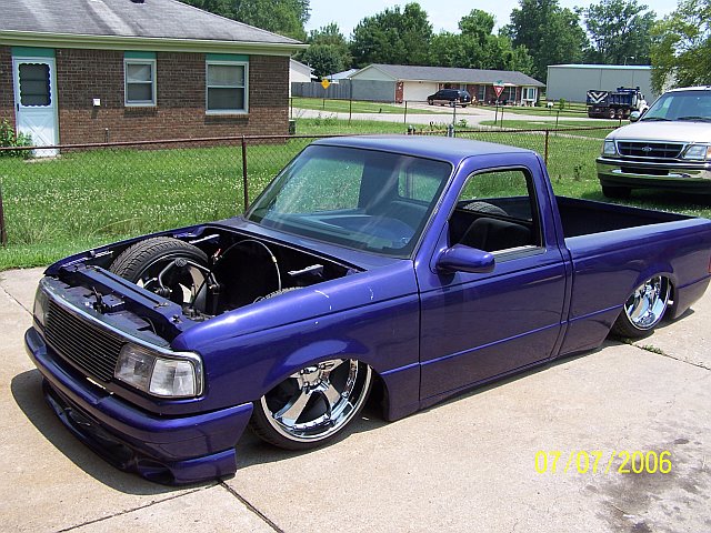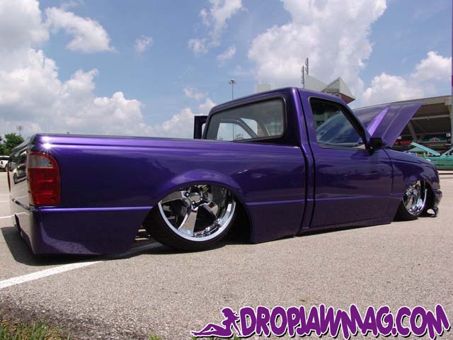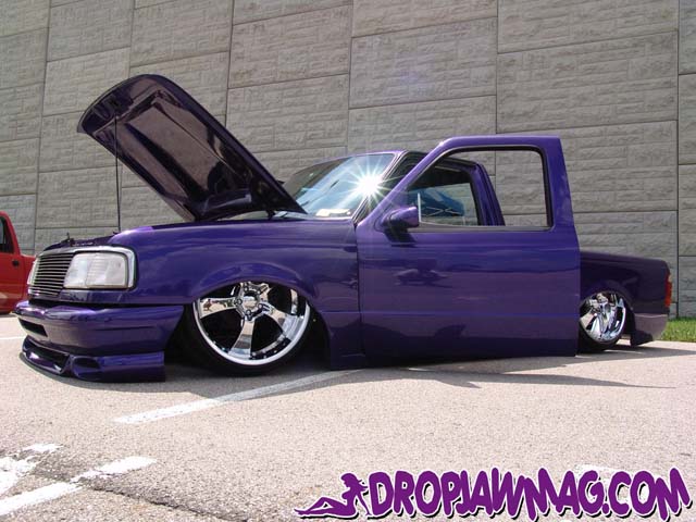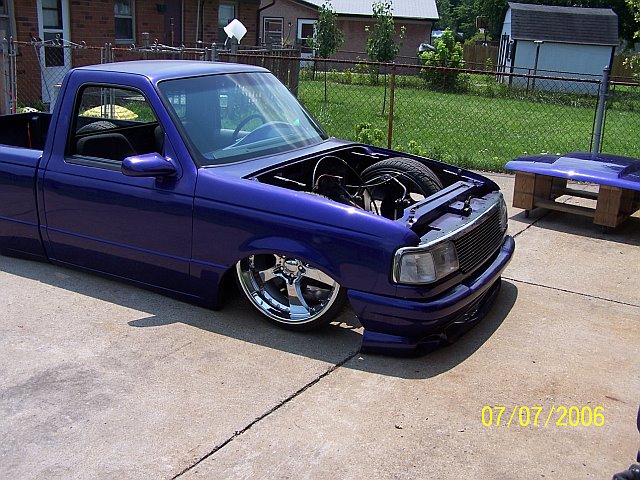 3.5 in. stock floor bodydrop, 98 ranger front clip, raised upper control arm mounts, new frame from the firewall. Nissan 300zx rearend. Lowered the engine 1.25in. Setup for 22s all the way around. All suspension work done by owner and