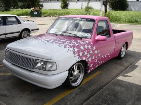 shaved emblems,doors,antenna,3rd brake lite, body seam on back of cab, & stake holes,full skin combo w/ frenched plate, crystal headlites, clear corners, billet grill , street scene mirrors, ppg magenta basecoat white stars and baby blue pinstrippin.