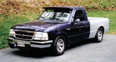1/2 Boysenberry Pearl 1/2 grey primer; Shaved stake pockets; shaved tailgate handle; molded rollpan with frenched license plate offset to passenger side; hole cut in bed in preperation for bags; Checkmate flush tonneau; acetoned fender emblems; body color Ford oval; gutter guard grille; tinted windows; 2002 Ranger XLT front bumper