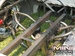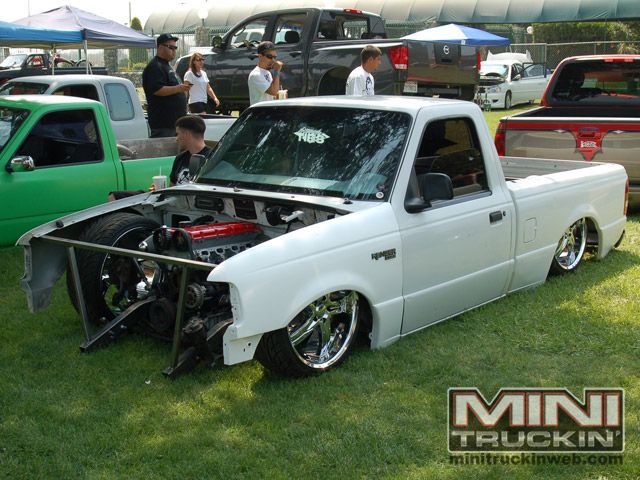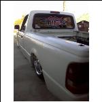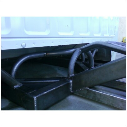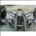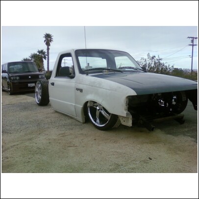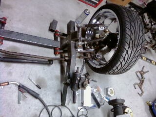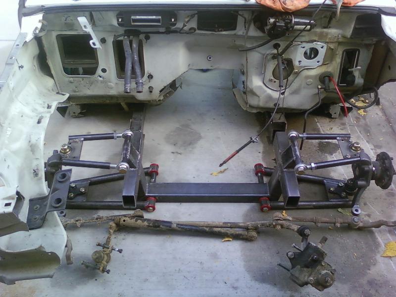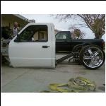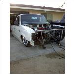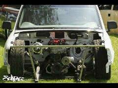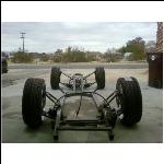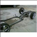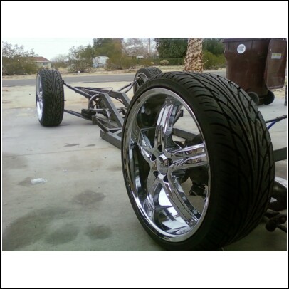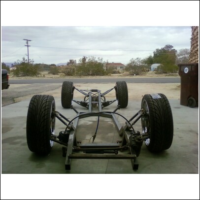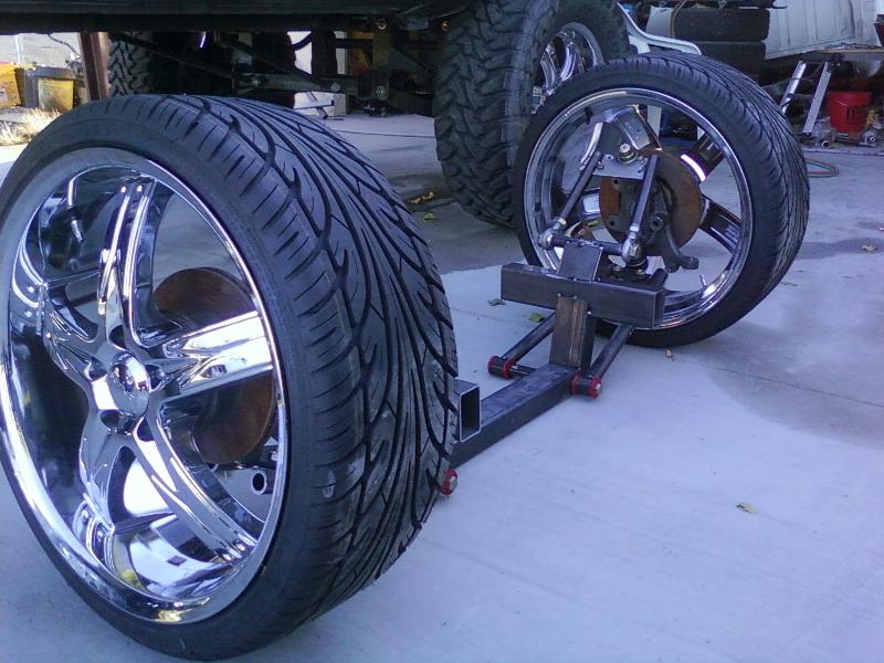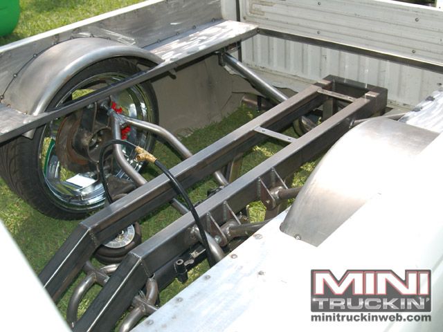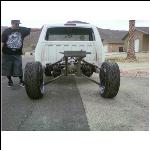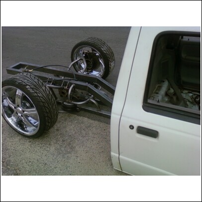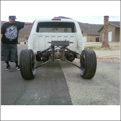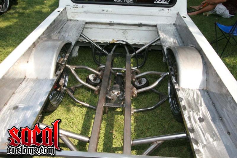 6 inch slams, new cross member built to toyota specs to narrow out the frame. homeaid chromoly control arms, toyota steering linkage. Subaru indipendent rear differential. WHAT???, look out.... Homemade rear spindels. Full frame. 3 in. Stock floor body drop. All steel fabrication and engine work performed by Scott Barker at SB Fabwerxs in 29 Palms California. For contact, check out his StreetSource. 'sbfabwerx'
