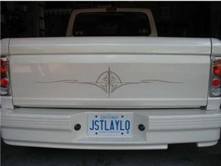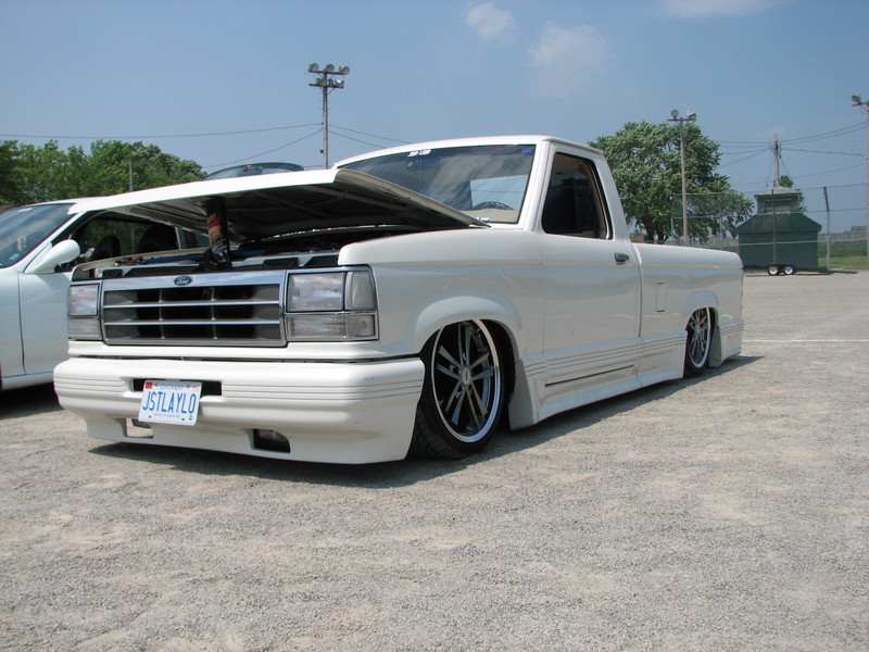 1992 Explorer grill and headlights. Shaved Emblems, mirrors, stake holes and tailgate. Custom Cadillac Ice Pearl paint by PPG. Euro style taillights. Yah, I know the truck has a kit, but there's a reason for it. The truck is a stock Ranger GT, and there very, very few ever made. (800+ in 88 and 600+ in 89) The skirt package was OEM on these GT's, and that's why it's still on the truck....