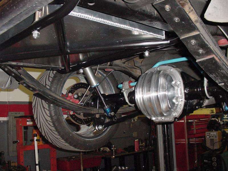 3" Trailmaster lowering I-Beams, rear flip with Flipped Shackles. Suspension Techniques sway bars front and rear. Poly Bushings. Narrowed and powdercoated 8.8 w/9" housing ends, Currie 31 spline axles, Eaton Posi, 4.10 FMS gears, Bullit 12 inch disk brakes. Bilstien Shocks front, FOX 2.0's rear. Cal Tracs bars and aluminum leaf bushings.