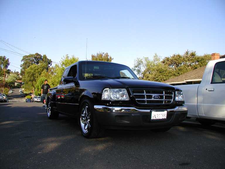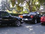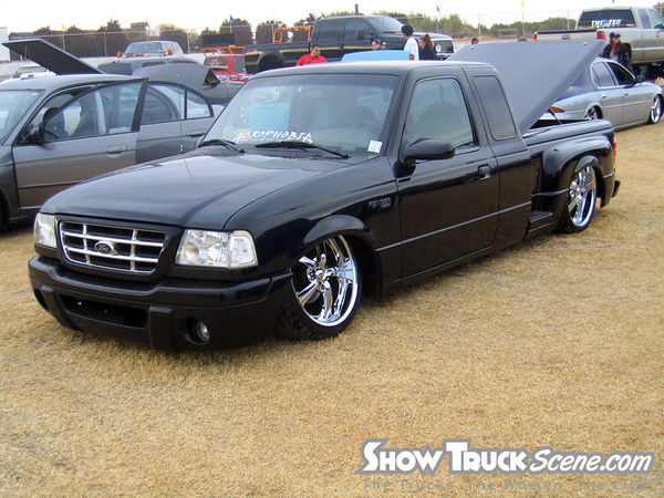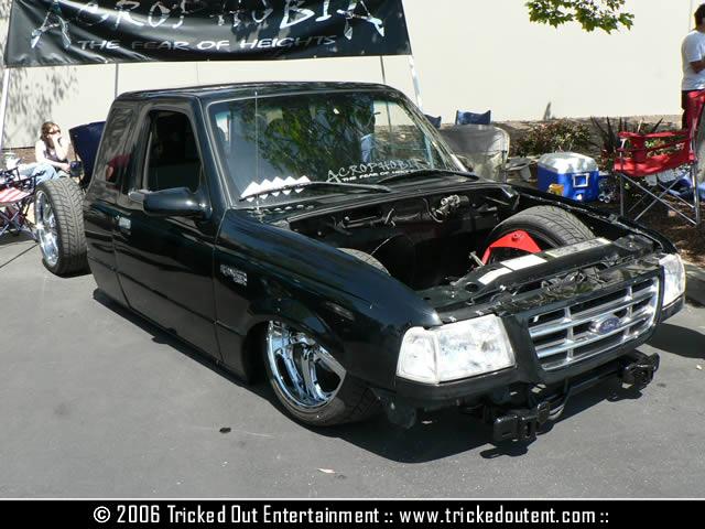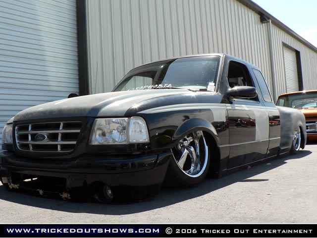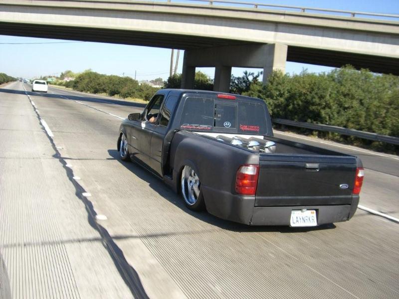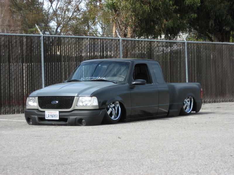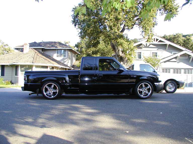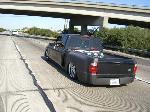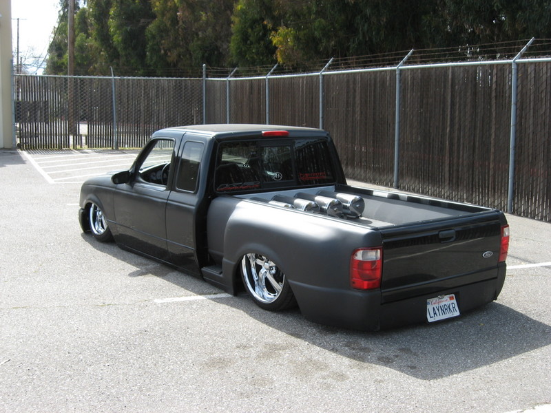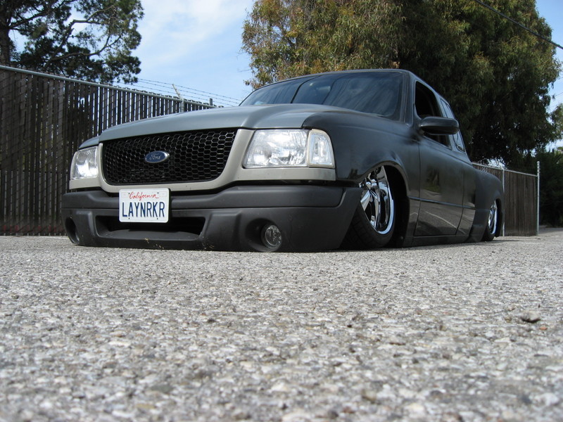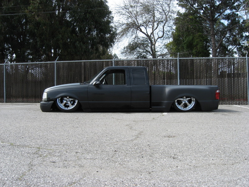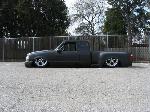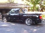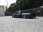 Eli @ Air Concepts Fab did a Stock Floor on a Powder coated frame. Raised bed sides, Sheeted bed, Shaved Handles, Grant Customs Roll pan, SS mirrors, clear corners, Edge Hoo, Bumper, and fog lights...Lots-A-shades of black!
