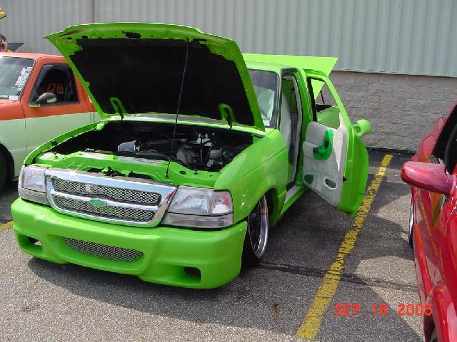 body droped, shaved doors, emblems, wiper cowl, roof seams, third break light, gas door, and slat pockets, smooth rollpan, license plate in tailgate, ss front bumper, green paint job