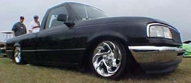 shaved handles, shaved windshield wiper cowl, shaved tailgate with cali rear combo, shaved mirrors replaced with flamed teardrop chopper mirrors, fuel cell, billet grill, airbrushed hood