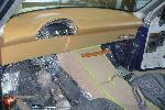 1956 ford f-100 dash full dakota digital tru blue gauges full fiberglass center console with switches and gauges mounted in painted to match seast fully covered and other pieces two toned with dark gray and some light gray suede ididit chrome tilt steering column nrc tribal billet steering wheel billett lecarra steering wheel adaptot