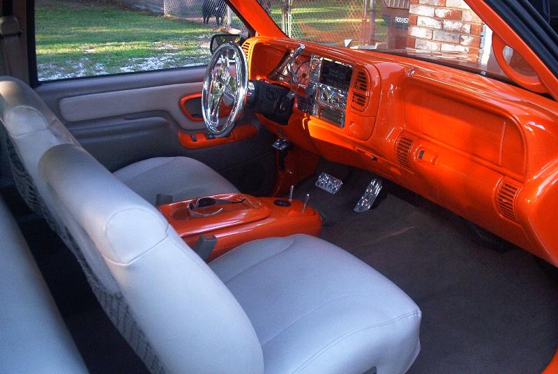 Fully smoothed & painted Tangalo Orange Pearl with custom leather seats, B.A.D. Inferno steering wheel & door sill plates, & lots more billet.