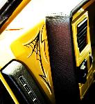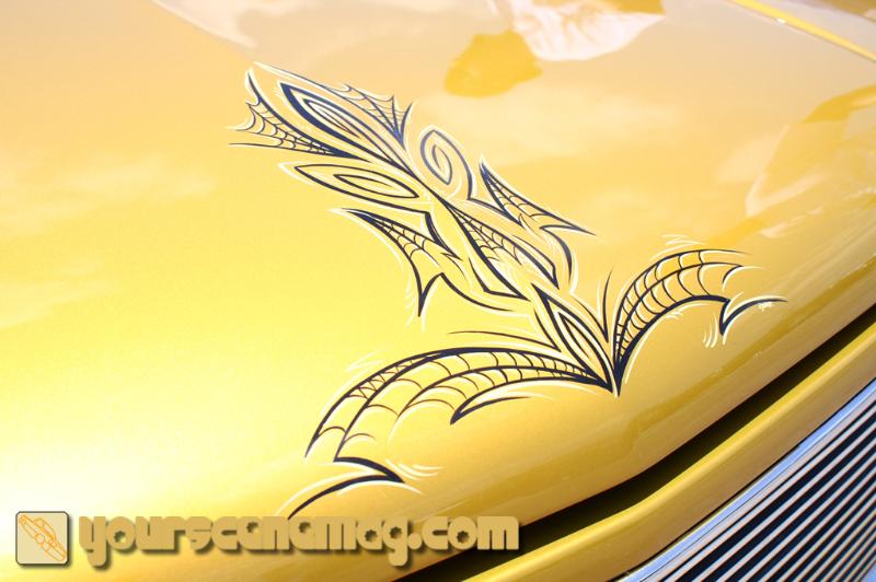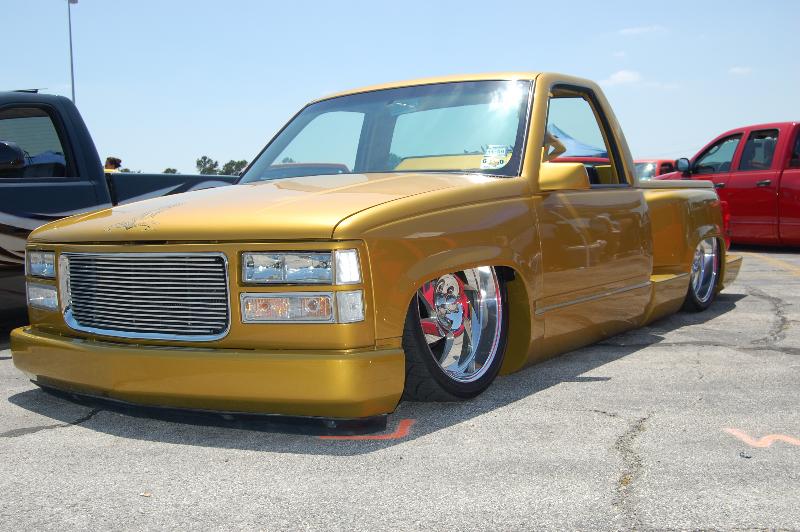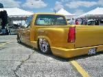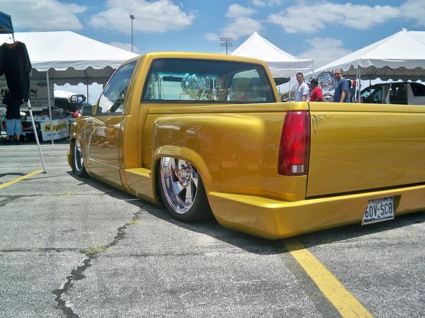 Shaved handles, shaved steps, shaved stake pockets, shaved tailgate handle, sectioned rear fender, molded Grant Kustoms steel roll pan, front fender skirts, inner fenders, raised factory bed floor, pinstriped by the Famous Crash out of Autin Tx....www.itdontstop.com