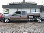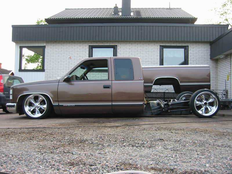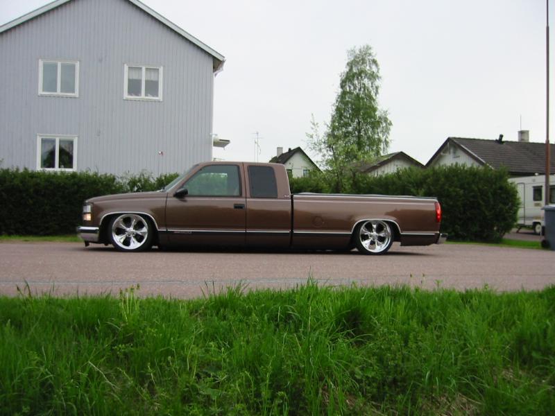 Bagged in all 4 corners. Art coolride kit with control arms up front and ART parallell 4-link with HAL shocks in the back. 4 way setup. 1/2 inch lines in entire setup with ART Big Red valves. Engine driven York comp. A 6 gallon tank with 8 3/8 ports under the bed and a 24 gallon tank with 3 1/2 inch ports in the bed. Custom made c-notch. Lays frame.