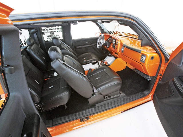 black leather with stingray inserts, painted dash, billet, monitors moulded into the headliner all done at Big Daddy Upholstery