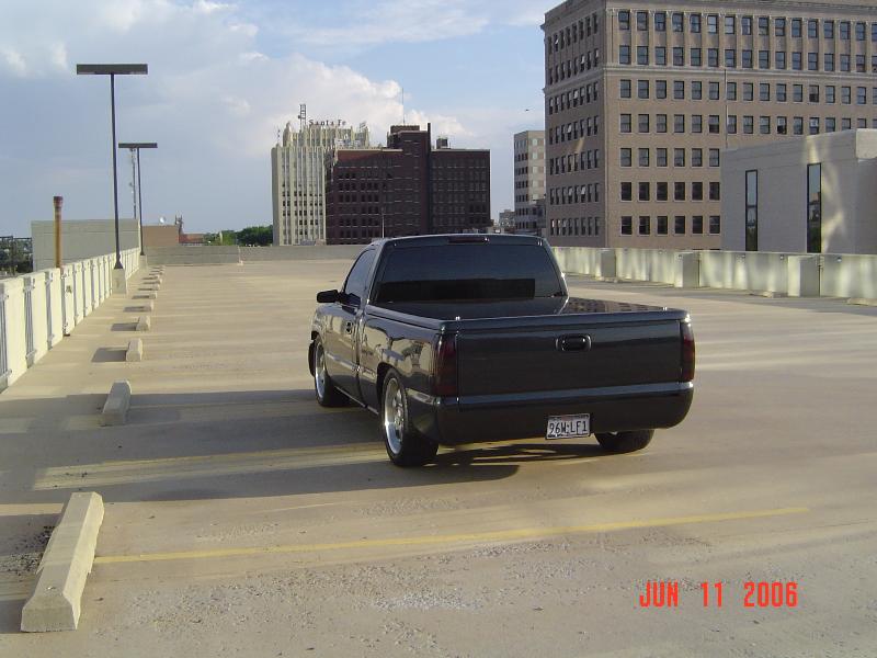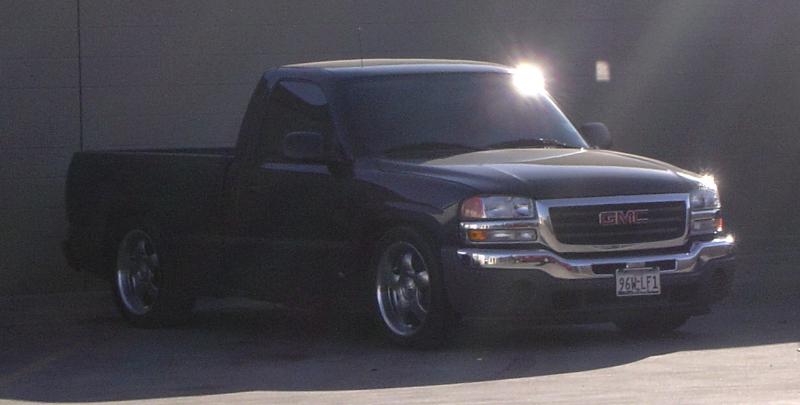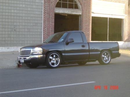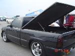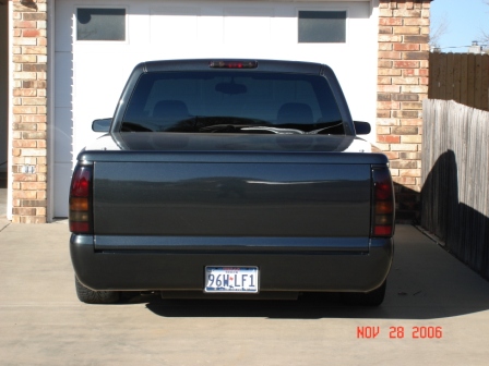 Dark Spiral Gray Metalic paint, Removed moldings and emblems, 8% tint on the windows, Smoked tail lights, Carriage Works billet grill, custom fiberglass front bumper, color match street scene mirrors, denali back door handles (NO key holes), color match snug lid, TYC denali style projector head lights, TYC clear parking light, Sir Michaels steal roll pan, shaved tail gate,60 inch.L.E.D. (Body work done by Larry at KUSTOM BIKES).