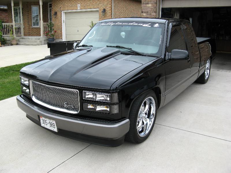 Stock Black with two tone 2010 GM Greystone Metallic on rockers,Street Scene speed grille insert with 1970's Sierra emblem,Painted and smoothed Denali handles,35% Tint, black/chrome parking lights,Black/chrome Headlights with 8000K HIDS,smoked OEM Style Corners,Red with Smoked Reverse Stock style LED Taillights, billet antenna, Smoothie Painted front bumper with custom Frenched plate, Goodmark Cowl hood, Ultamite Lining spray in bed liner. checkmate tonneau, Shaved Tailgate handle, Grant Kustoms molded roll pan