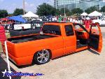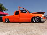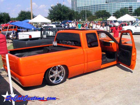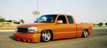 House of Kolor Tangelo pearl shaved door handles and taillights, third brake light, stake pocket holes, amd rain gutters, moldings, emblems, and gas door, shaved license plate brackets, beefy billet grill, Denali Headlights, molded in tailgate skin and roll-pan, shaved and relocated mirrors, billet tailights and mirrors, 40"x40" sliding ragtop, billet wipers