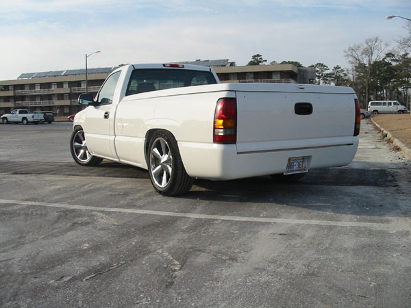 billet grille with painted perimeter, bed cover,molded roll pan, cowl hood, painted mirrors, shaved tailgate, and some stickers