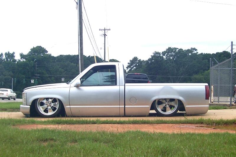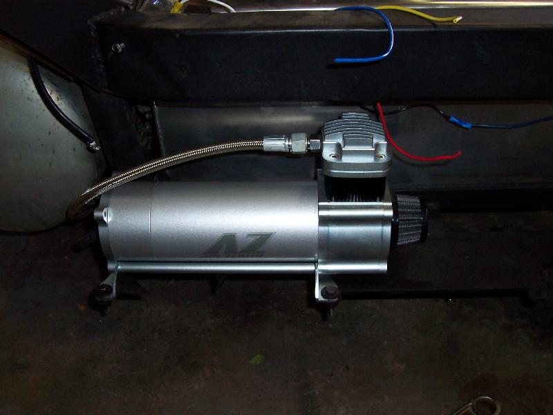 slam 7's in the front and 8's in the rear handbuilt frame from the firewall back stock floored with a AZ compressor Also I slid the cab back on the frame to get more clearance as not to tub the firewall as much