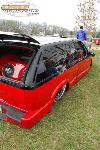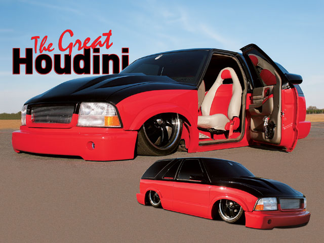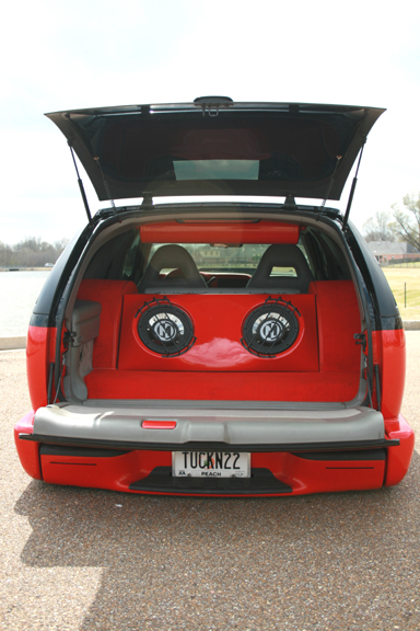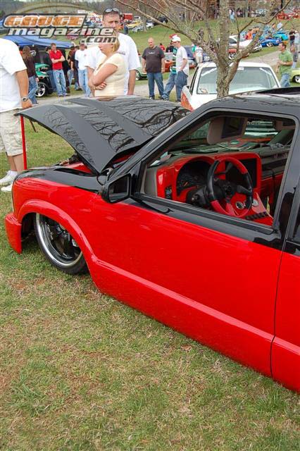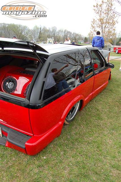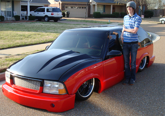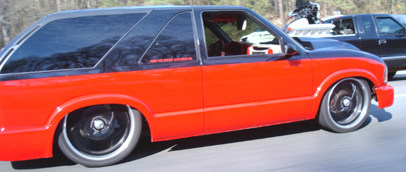 3" stock floor and 3" traditional = 6" body drop, doors sit about 1/4" from the ground; custom built hood; 98+ body style bumper with 2" added to the middle; raised hood and fenders 1.5" to clear the wheels; shaved: hood squirters, antenna, door handles, roof rack, 3rd brake light, gas door [relocated to the roof], tail lights, tag lights, rear wiper, passenger wiper; LEDs in rear bumper; painted Dupont Viper red and Kalapana black; suicide doors.