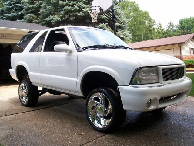 shaved handles, antenna, roof rack, tailgate, relocated 3rd brake light. '98+ headlights, billet grill, Envoy bumper, Cal-Vu Mirrors, 37.5" x 68" ragtop