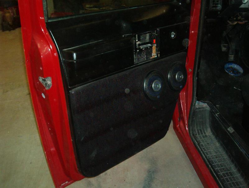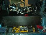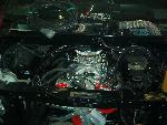 4 Blazer bucket seats ( Back with red stripes) ,rear floor cut out and dropped 8" for 4 battery's, , pumps mounted on top of the bridge notch. black alligator(fake)on lower doors and the head liner and rear side panels, rest of interior painted satin black, new black carpet, and stuff...