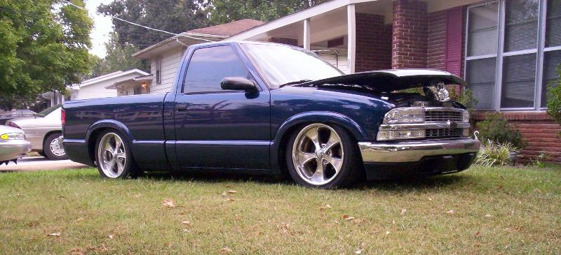 shaved antenna, tailgate, hood pissers, rain drips and 3rd brake lite, molded FBI roll pan, tag in tailgate, s10 front end conversion,