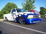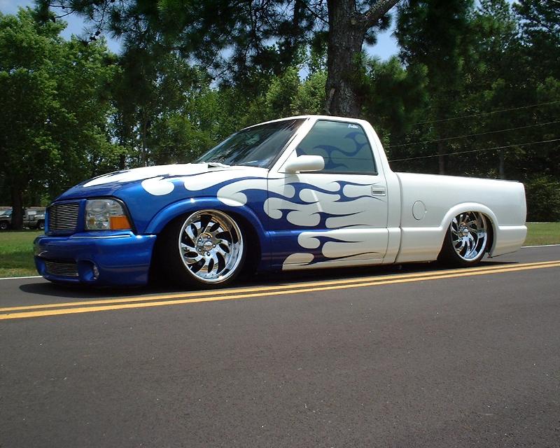 WHITE WITH BLUE GOTHIC TRIBAL FLAMES STRIPPED IN SILVER WITH PURPLE PEARL GHOST FLAMES INSIDE THE FLAMES. SHAVED ANT. TAILGATE HANDLE MOLDED IN ROLLPAN WITH ANGLED TAG, GMC ENVOY FRONT END, BILLET GRILLES, COWL HOOD, PAINTED WIPER ARMS, EURO TAILIGHTS, BED COVER, TINTED WINDOWS WITH FLAMES IN WINDOW TINT