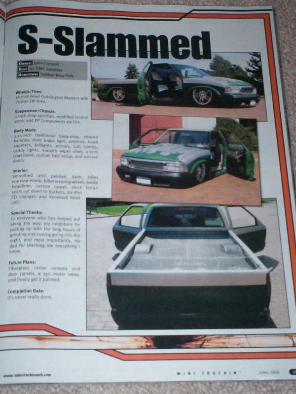 2nd Under Construction Mini @ Carlisle 2010, August 2009 Truckintube.com truck of the month, 1st Place Magnetic Minis Mild s10 '05, Various trophies from local shows, October 2004 and September 06 Truck Of The Month @ S10OWNERS.COM