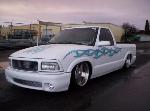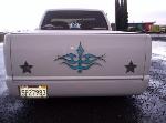 White w/ Light Blue Flames striped in black with stars shadowed throughout. 63 Stars throughout the suspension and tint and paint ect. 7" Star tail lights with LEDs