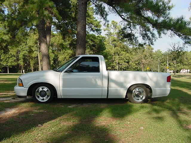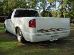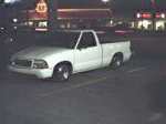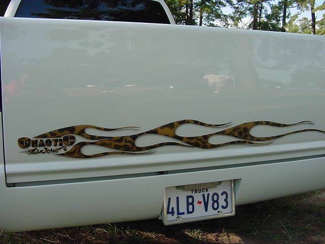 olymic white, fully shaved (except for 3rd brake light and tails) relocated antenna 5"x6" drop, gmc jimmy headlights, Tailgated has graphics on it by Max Maxwell from Chotic Customs, in Tomball,Tx....