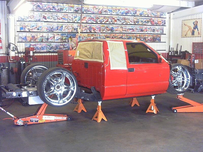 3-link, 2800 lb bags all the way around, 80 psi ride hieght and that is untucking a 24, Suicide arms up front, dump bed, Oasis XD 3000, SSBC 13" brakes in front, disc brake conv. in rear